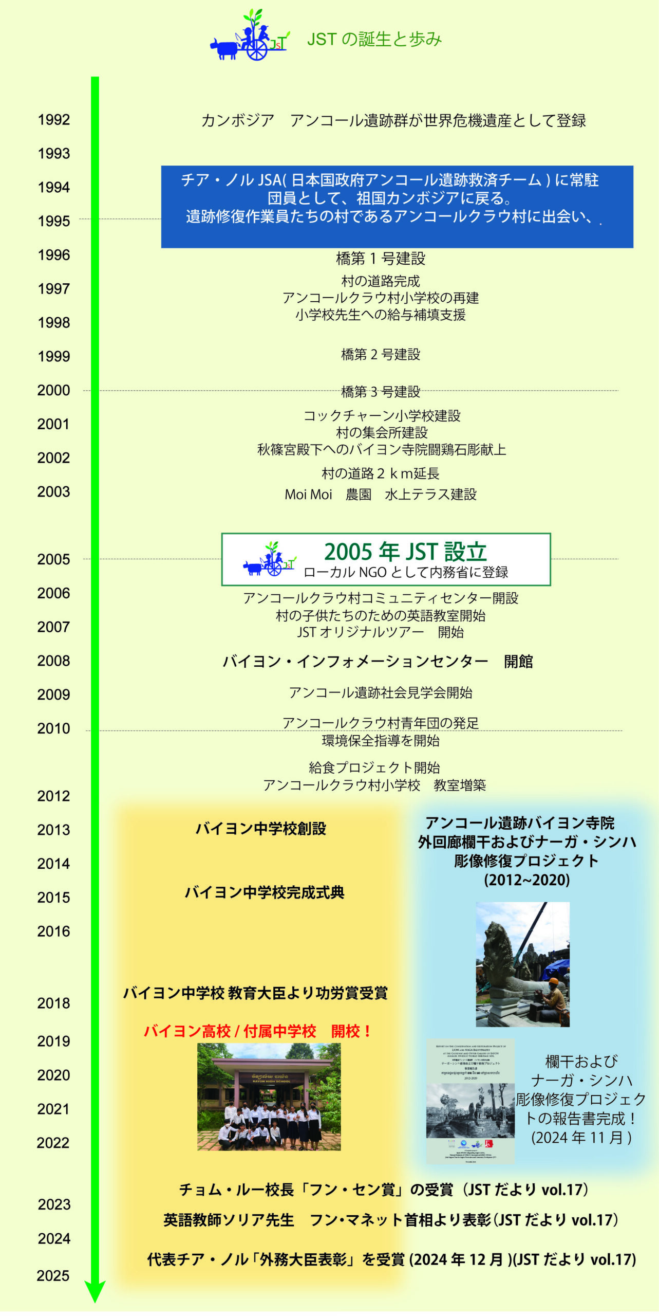 JSTのあゆみ 2025.09.18 2022.04.16 アンコール遺跡周辺にはたくさんの村があり,人々の今の生活があります。 しかし、海外からの観光客が年々増加する一方、遺跡のある地域に住む人々は教育も十分に受けられず、道路や橋などのインフラ整備もされない村で暮らしていました。 JSTの活動は、カンボジア人でありながら日本で教育を受け、アンコール遺跡修復の仕事に携わっていたチア・ノルと、遺跡修復現場で働く日本人専門家の、小さな一歩から始まりました。