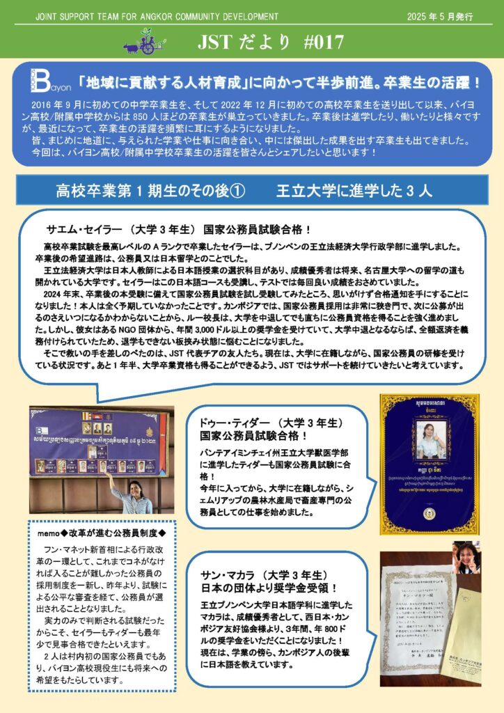 JSTだより 2025.09.18 2022.06.22 年に数回配信されている「JSTだより」では、カンボジアの子供たちの声を皆様に届け、JSTの今を伝えています。 最新号!JSTだより Vol.17 2025年5月「地域に貢献する人材育成」に向かって半歩前進。卒業生の活躍! JSTだより Vol.16 2024年10月英語教師不在のバイヨン高校。英語学習はどうしている? ほか JSTだより Vol.15 2023年10月 バイヨン高校 卒業第一期生の進路はいかに? ほか JSTだより Vol.14 2023年3月 コロナ禍で始まったデジタル活用の実態に迫る! ほか JSTだより Vol.13 2022年8月 コロナ禍で学校閉鎖中 生徒たちの学習状況はいかに? ほか JSTだより Vol.12 2022年5月 創立9年目のバイヨン高校/付属中学校の”今” ほか JSTだより Vol.11 2021年6月 修復事業完了報告その②~人材育成・修復行程編~ ほか JSTだより Vol.10 2020年12月 修復事業完了報告その① 8年間ありがとうございました!ほか JSTだより Vol.9 2020年2月 2019年11月1日、ついにバイヨン高校 開校! ほか JSTだより Vol.8 2019年9月 バイヨン中学校の教師不足問題とその対策 ほか JSTだより Vol.7 2019年7月 バイヨン中学校退学者について知りたい!➀ ほか JSTだより Vol.6 2019年3月 バイヨン中学校生徒たちの生活について知りたい ! ② ほか JSTだより Vol.5 2018年12月 バイヨン中学校の長期休暇 ほか JSTだより Vol.4 2018年9月 バイヨン中学校生徒たちの生活について知りたい!① JSTだより Vol.3 2018年6月 バイヨン中学校 初めての文化祭 JSTだより Vol.2 2018年3月 バイヨン中学校が功労賞を受賞しました! ほか JSTだより Vol.1 2017年12月 バイヨン中学校5年目スタート!~今年度から人数増加に伴い二部制に! ほか